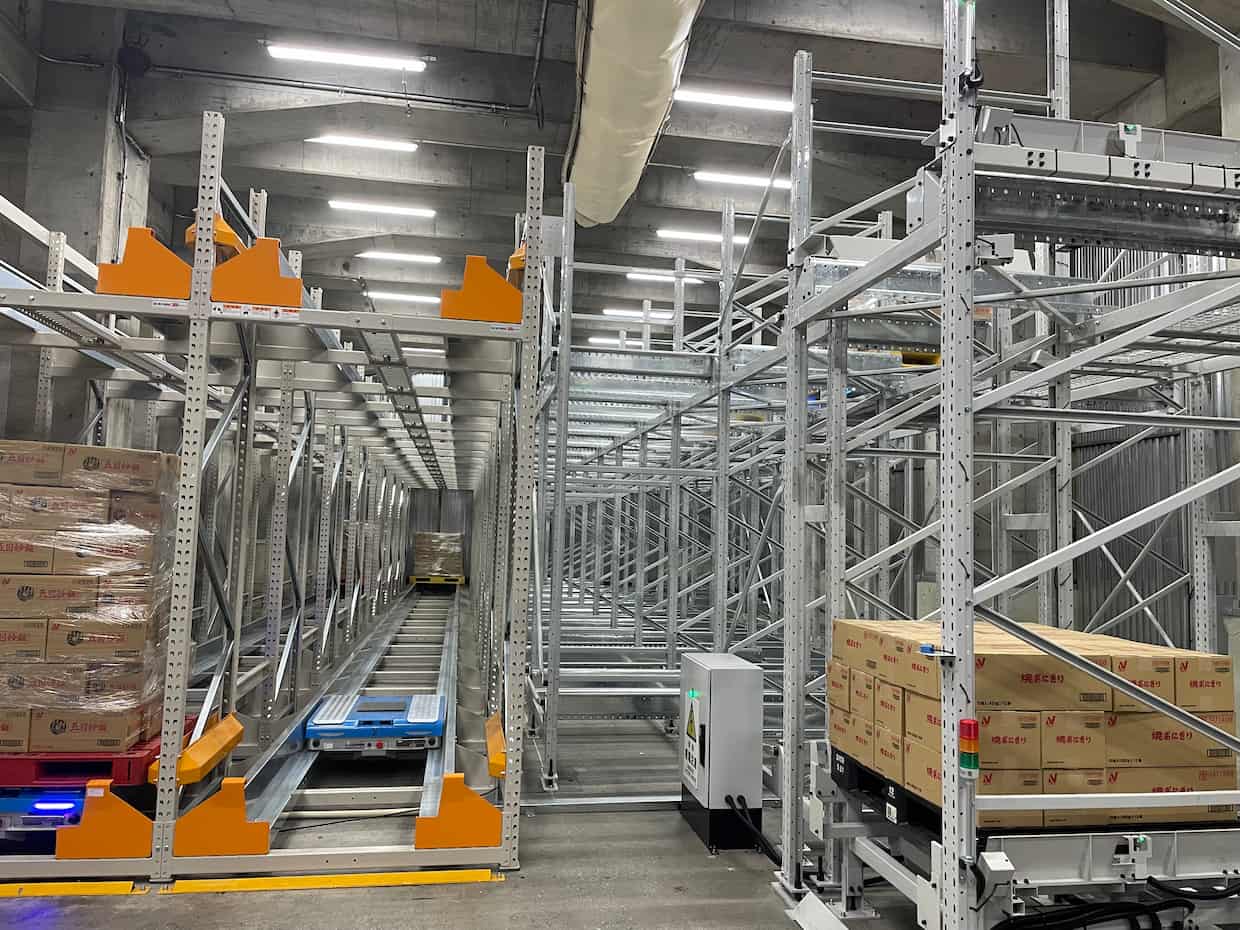冷凍エリアには平行水平シャトルと3Dパレットシャトルが稼働。特に3Dパレットシャトルは同施設に導入されたばかりのソリューションであり、既存冷凍倉庫への後付け設置が可能な柔軟性と、保管効率向上における実用性が期待される自動化システムであることが解説された。