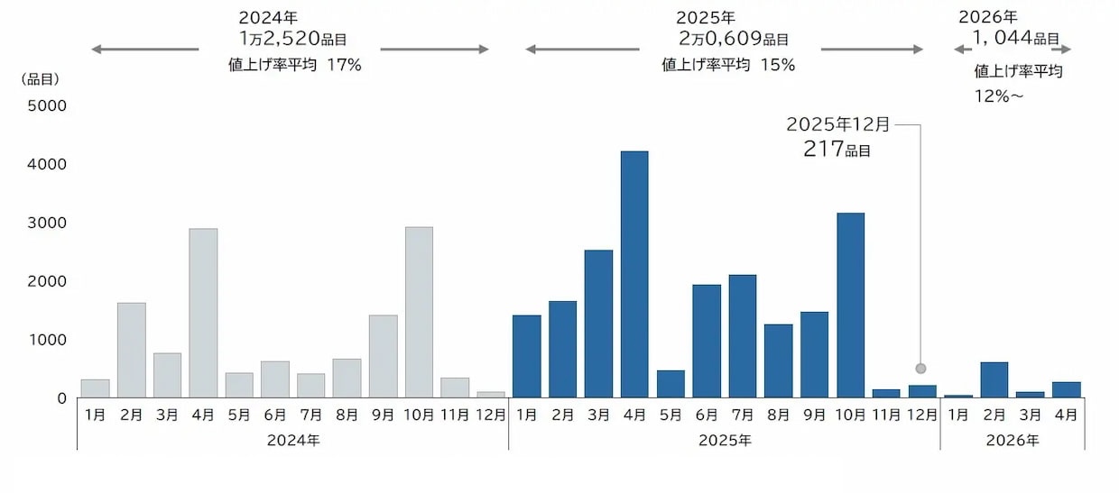 調査・データ帝国データバンク(TDB)は28日、ことし1年間の飲食料品値上げは計2万609品目で、前年実績1万2520品目を64.6%上回り、2023年の3万2396品目以来、2年ぶりに2万品目を超えたとするレポートを公表した。26年については、値上げラッシュがいったん収束し、22年以降で最も少なかった24年を下回る水準で推移することが見込まれる。