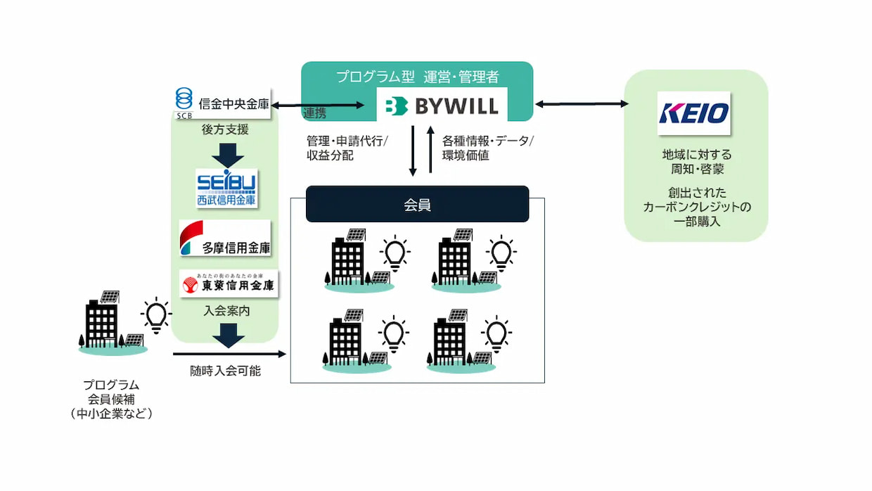 今回の事業でバイウィルは認証取得に向けたプロジェクトの企画・管理、モニタリング報告書の作成、認証取得手続き、さらに創出されたクレジットの販売・無効化および参加企業への収益分配を担う。あわせて、金融機関である信金中央金庫、西武信用金庫、多摩信用金庫、東栄信用金庫が持つ都内中小企業5万8000社を対象とする強固なネットワーク、および、交通事業者の京王電鉄と協力し、参加企業の募集、周知、セミナー開催などを展開する。京王電鉄は、自社が保有する沿線広告媒体などを活用して本事業の周知および啓蒙活動を行い、加えて創出されたクレジットの一部を購入、自社の環境対策に利用することで「都内での地産地消」を実現し、沿線地域のカーボンニュートラル(CN)化に貢献する方針を示している。