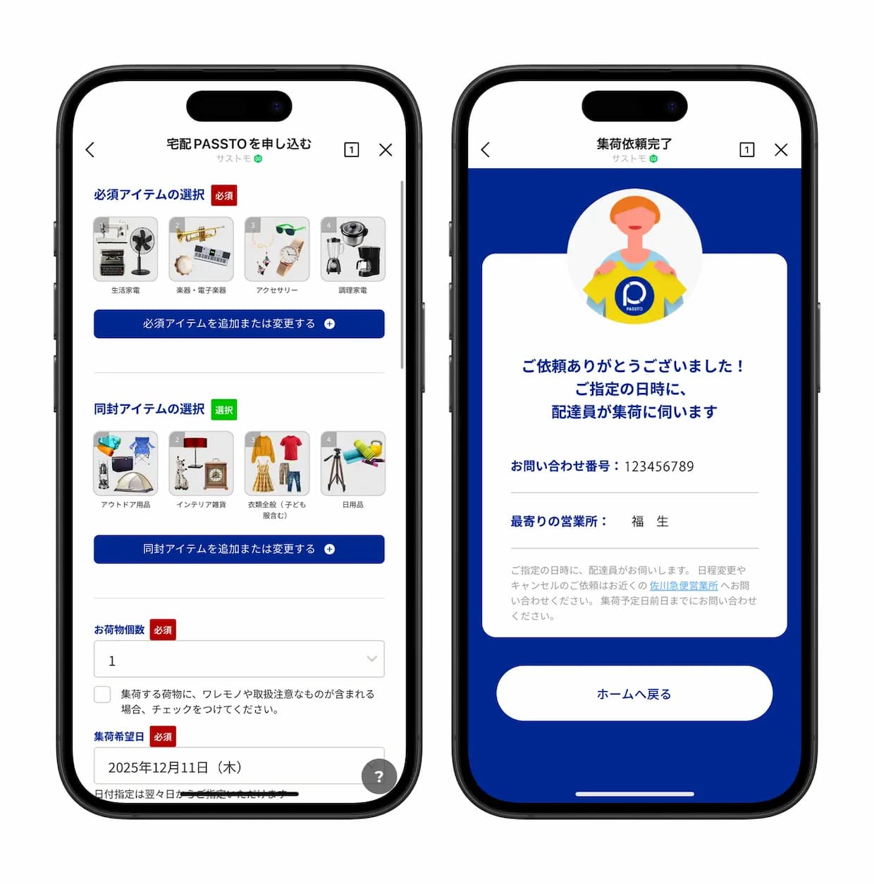 サービスは、24年9月12日-10月31日に関東・中部・関西エリアで試験提供を行い、44トンの不要品を回収した。回収品はECOMMITが選別し、再流通またはリサイクルしている。本格提供後は利用が拡大していることを受け、ことし11月27日からLINEミニアプリでの申し込みと集荷依頼機能を追加した。
