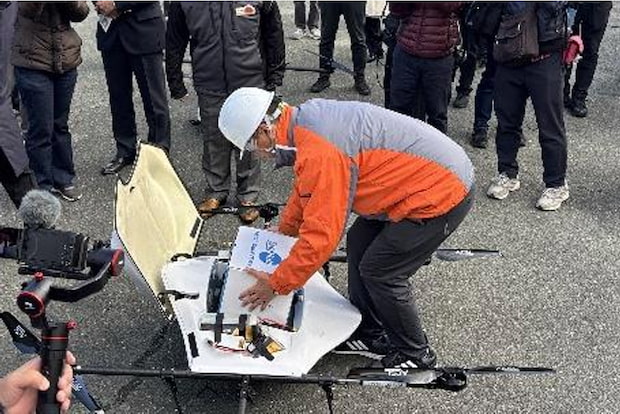 ▲物流専用ドローン「「AirTruck」」に荷物をセットするグリーンサービスのスタッフ(出所:セイノーホールディングスなど)