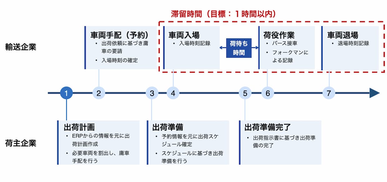 ▲入場から退場までの流れ。入場後に速やかに荷積みが始められれば、荷待ち・荷役時間が短縮できる。(出所:両備システムズ)