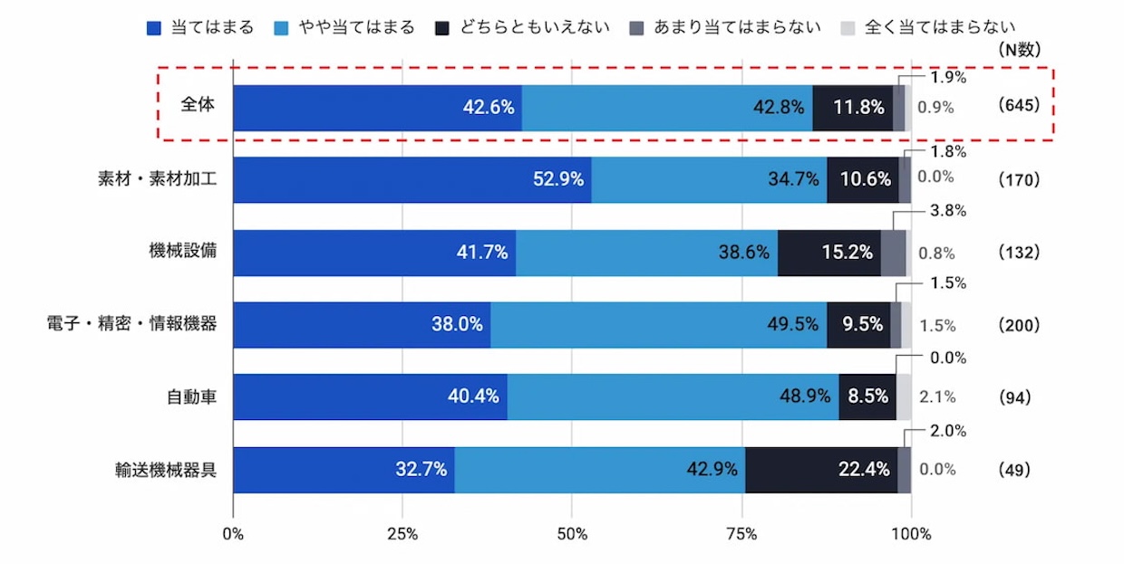 サプライチェーンの不安定化や為替変動、物価上昇、脱炭素、人手不足などの課題があるなか、外部環境の変化を、製造業に従事する課長以上の役職者がどのように捉えているのかを把握するため調査を行った。調査はインターネットを通じたアンケート方式で、10月24日から11月13日まで、素材・素材加工や機械・設備、電子・精密・情報機器、自動車、輸送機器の5分野の企業の役職者を対象に実施。645人から回答があった。