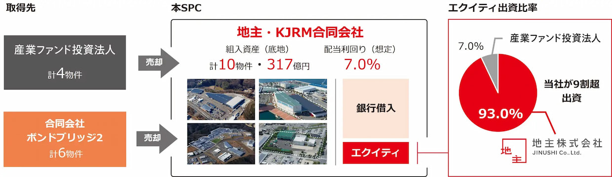 拠点・施設地主(東京都千代田区)は4日、米KKRグループのKJRマネジメント(同)が資産運用を受託する産業ファンド投資法人(IIF)との共同事業として、物流・工場向け土地10物件を組み入れた特別目的会社(SPC)「地主・KJRM合同会社」を組成し、匿名組合(TK)方式で出資すると発表した。出資額は75億3000万円で、エクイティの93%を地主が担い、同TKは特定子会社に該当する。