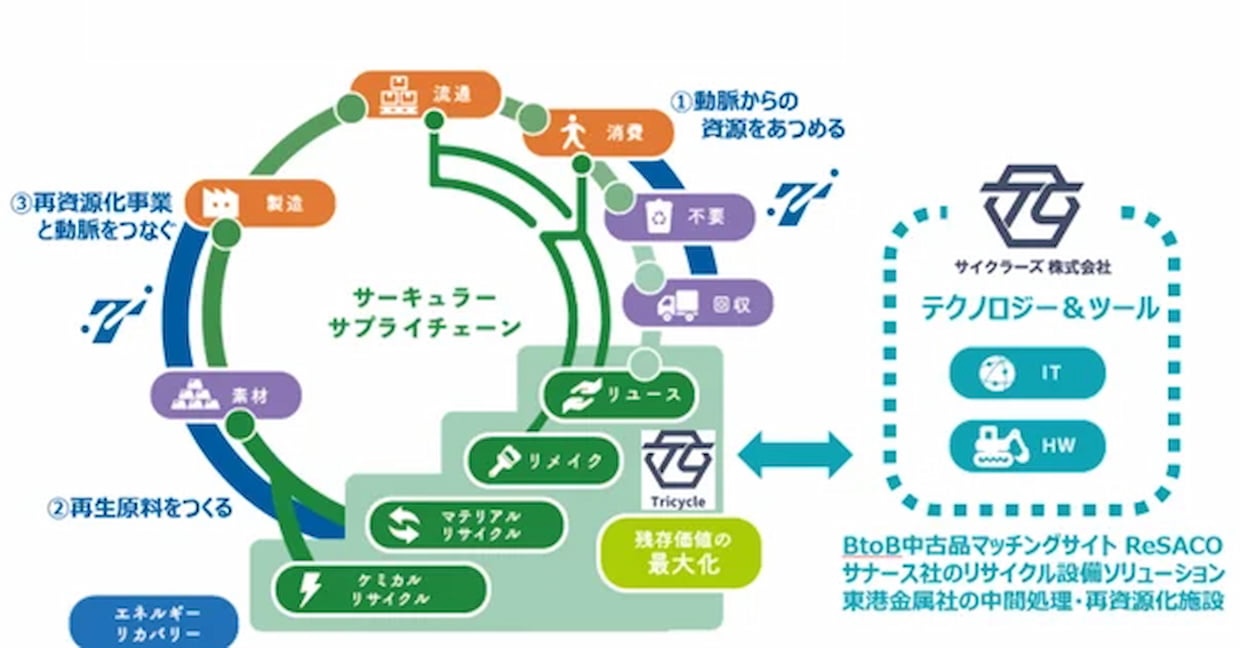 M&Aトライシクル(東京都品川区)は5日、豊田通商とサーキュラーエコノミー実現に向けた業務提携を12月1日付で締結したと発表した。企業の不要資産と必要とする企業をつなぐリユースマッチングプラットフォーム「ReSACO」(リサコ)を活用し、リユース事業の拡大や循環型ビジネスモデルの共同開発を進める。
