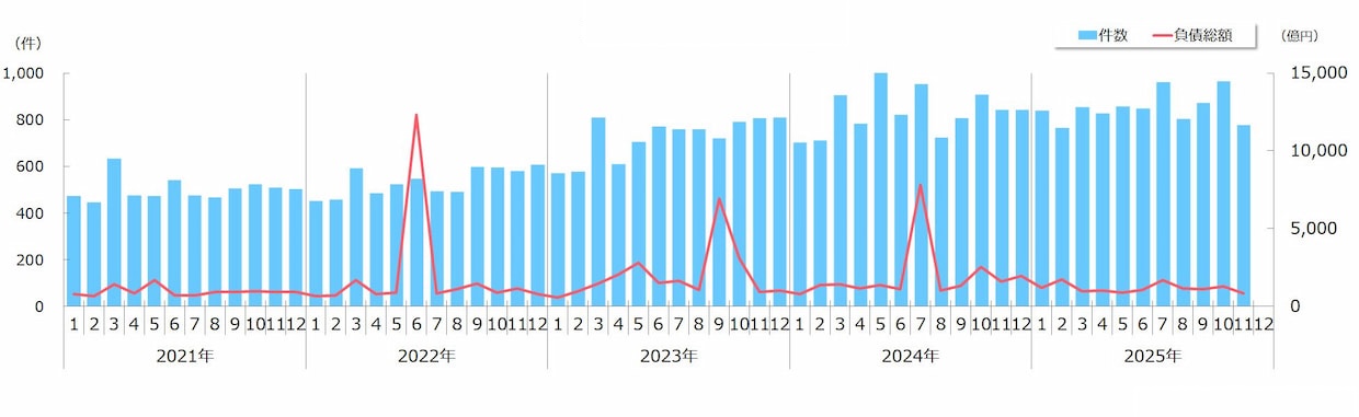 調査・データ東京商工リサーチ(TSR、東京都千代田区)は8日、先月の全国企業倒産(負債総額1000万円以上)は778件(前年同月比7.4%減)で、負債総額は824億300万円(同48.5%減)に上ったとする調査結果を公表した。ことし5月以来、6か月ぶりに前年同月の件数を下回った。1-11月の累計は9372件(前年同期比2.2%増)で、通年では2年連続で1万件を超えることがほぼ確実になった。