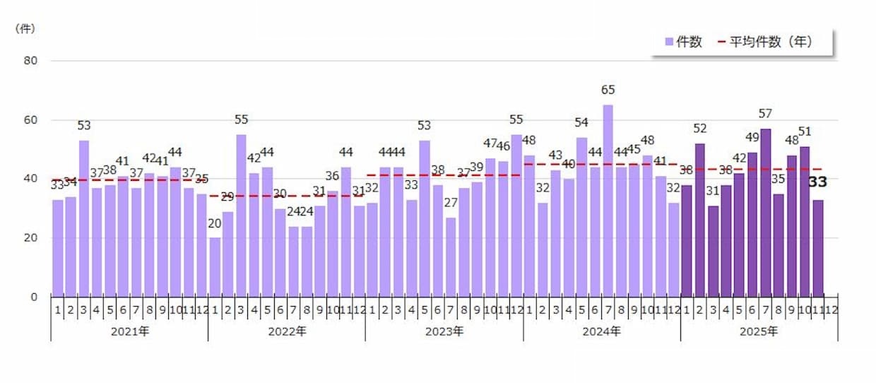 調査・データ東京商工リサーチ(TSR、東京都千代田区)は8日、先月に倒産した企業のうち、負債1000万円未満の倒産は33件で、昨年同月の41件と比べ19.5%減少したとするレポートを公表した。3か月ぶりに前年同月を下回り、ことし3月の31件に次いで、2番目に少なかった。ことし1月から11月までの累計は474件(前年同期比5.9%減)となり、月平均43.0件で推移している。