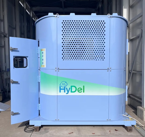 HyDelは、寒冷地で課題となっていた吸蔵合金からの水素取り出しと燃料電池の安定運転を可能にした据え置き型の装置で、定格出力は2キロワット。外寸は幅2500ミリ、高さ2500ミリ、奥行き2000ミリ、重量は1.8トンとされる。高圧ガスに該当しないため取り扱いが容易で、吸蔵合金は非危険物扱い。1万回以上の繰り返し利用が可能な耐久性を備える。
