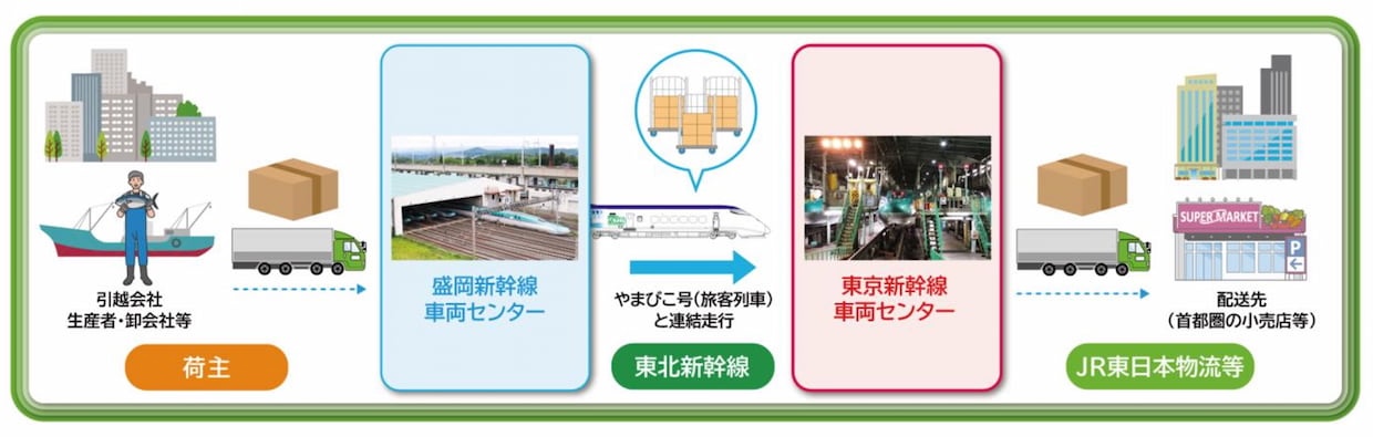 鉄道へのシフトは環境負荷の低減にも直結する。同社の試算では、盛岡-東京間540キロで4トントラック4台分の輸送を新幹線に切り替えると、ドライバー拘束時間を年間3万時間超削減し、CO2排出量を600トン減らせるという。
