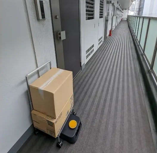 ▲各部屋への宅配物の搬送中の自律搬送ロボット(出所:Preferred Robotics)