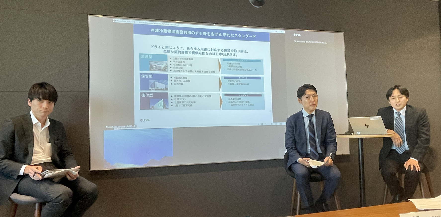 また南氏は、こうした課題がデベロッパーの賃料設定と、コールドチェーン事業者の想定保管料のギャップとして表れていること、さらに“アセット自前主義”が根強く、所有から賃貸への移行が進みにくい要因になっていると指摘。トークセッションでは、日本GLP営業開発部営業推進グループシニアマネージャーの伊藤晋氏、同部シニアマネージャーの草原洵也氏を交え、賃貸型冷凍・冷蔵倉庫の今後について議論した。