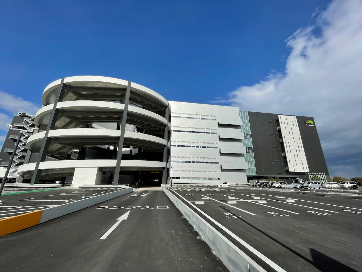 外観は、全容をつかめないほどの巨大さとダブルランプウェイが目をひく。ランプウェイからはセンター車路で各階のバースに接車する構造で機動力を確保している。