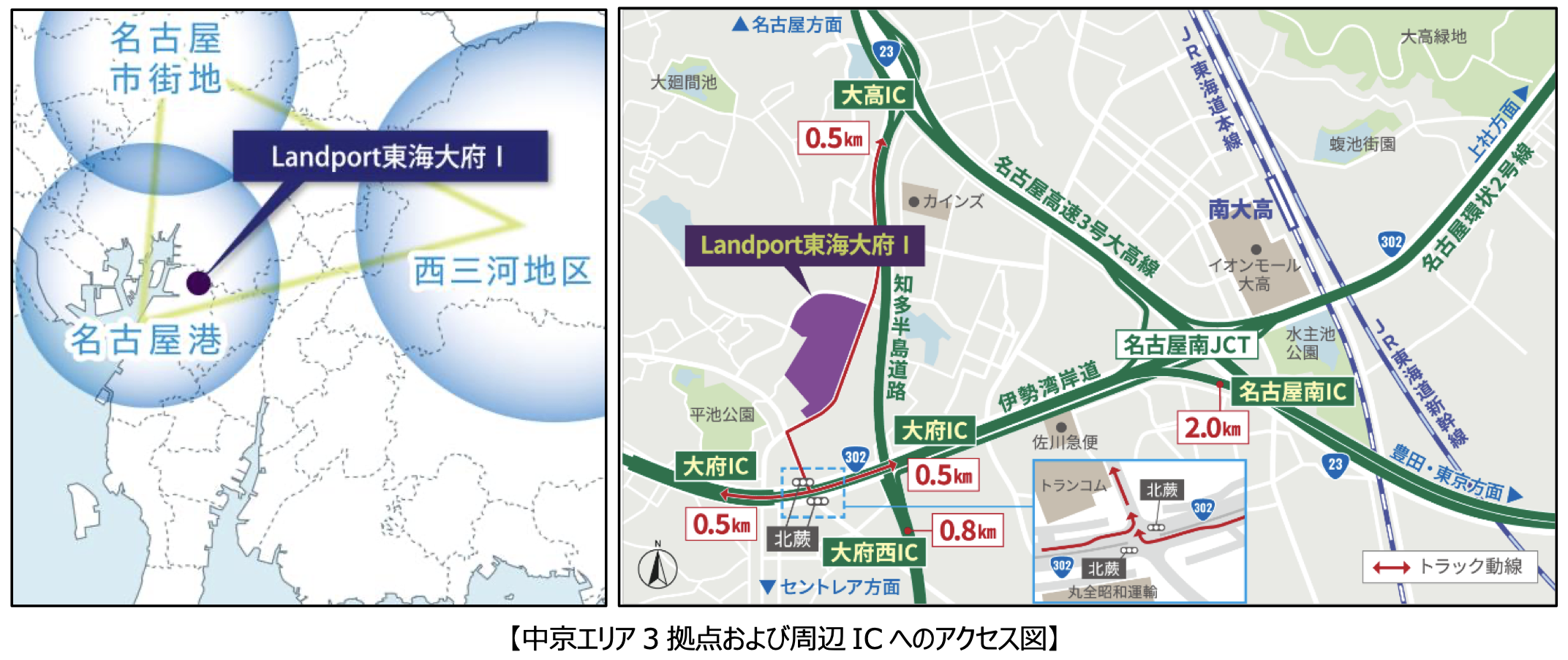 Landport東海大府Ⅰは、愛知県東海市と大府市にまたがる敷地面積9万8265平方メートルの巨大施設。東京と大阪の間の中継拠点としての機能、エリアの巨大消費圏である名古屋市内と西三河地区、さらに物流要衝である名古屋港の交点としての機能、さらに自動車産業などの生産地と都市消費圏をつなぐ機能においても“中心”となることを目指す。