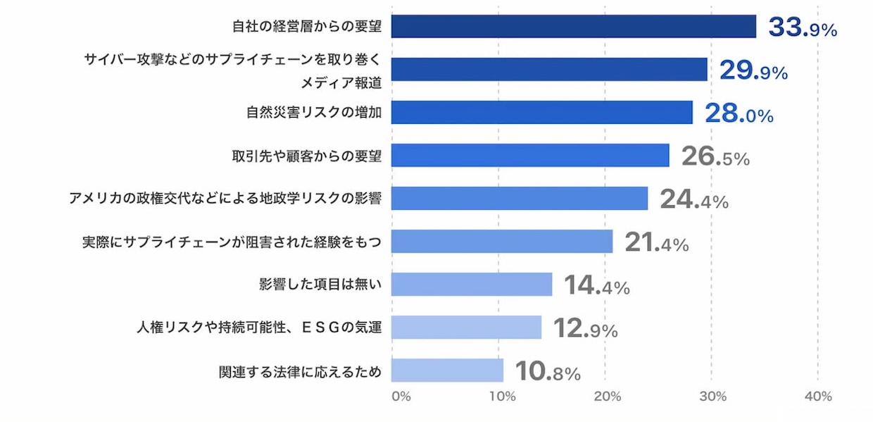 リスク認識の背景には、経営層の要請(33.9%)やメディア報道(29.9%)が大きく作用している。直近1年で実施した対策としては、BCP強化(35.4%)、自然災害対応(30.8%)、サイバーセキュリティー対策(25.8%)が挙がるが、いずれも対症療法的色合いが強く、サプライチェーン全体を俯瞰した体制整備には至っていない。