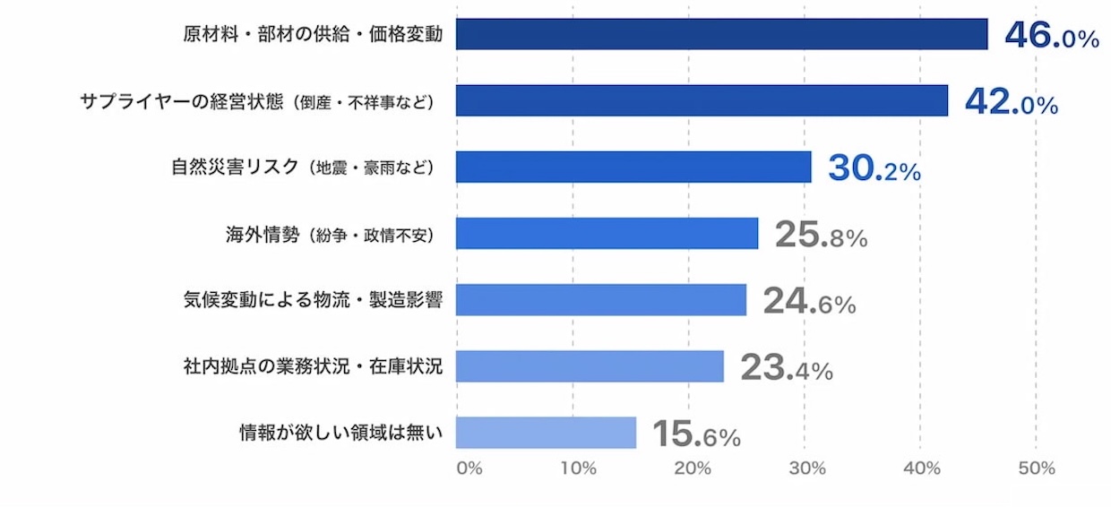 求める情報では、原材料供給・価格変動(46.0%)、サプライヤーの経営状態(42.0%)が上位に並び、外部環境の変動に対する脆弱性が際立つ。対応強化が期待されるサプライヤー可視化(42.4%)や外部リスク管理(32.0%)は、重要性の認識と実行が乖離したままだ。