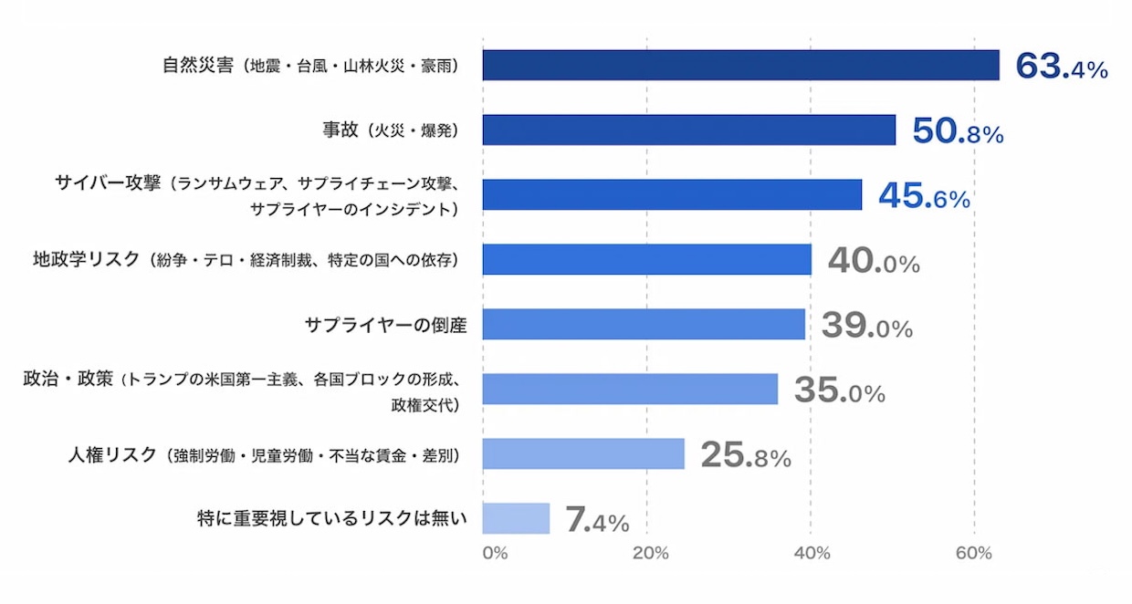 重要視するリスクでは、63.4%が「自然災害」を挙げ2年連続で首位となった。事故や火災なども上位に並んだが、増加幅で最も大きかったのは「サプライヤーの倒産」(前年比16pt増)。サイバー攻撃(同11.1pt増)、地政学リスク(13pt増)も大きく伸び、国際情勢やサイバー脅威が企業活動へ直接影響する構造が鮮明になった。