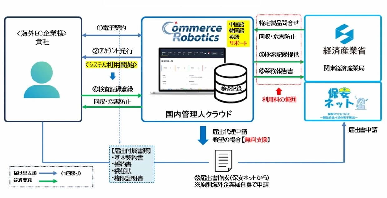 サービス・商品ビジネス向けSaaSサービスを手がけるコマースロボティクス(東京都港区)は15日、PSE(電気用品安全法)・PSC(消費生活用製品安全法)対象製品を日本向けに販売する海外EC(電子商取引)企業に対し、低コストの国内管理人サービスをリリースしたと発表した。管理業務がすべてクラウド上でできるため、国内管理人として必要な情報管理や報告業務をオンラインで済ませられる。英語と中国語、韓国語に対応が可能で、月額5000円から利用できる。