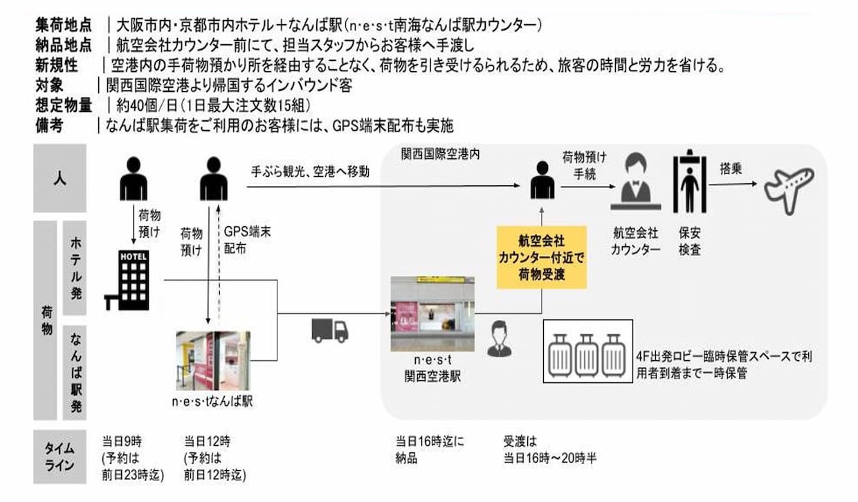 今回の実証実験では、訪日旅行者を対象に、大阪や京都市内のホテルや南海なんば駅から関西国際空港への荷物を配送するサービスを利用してもらい、ニーズや利便性などを検証する。