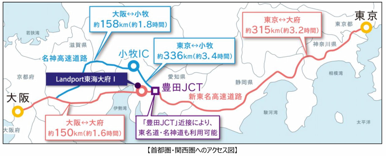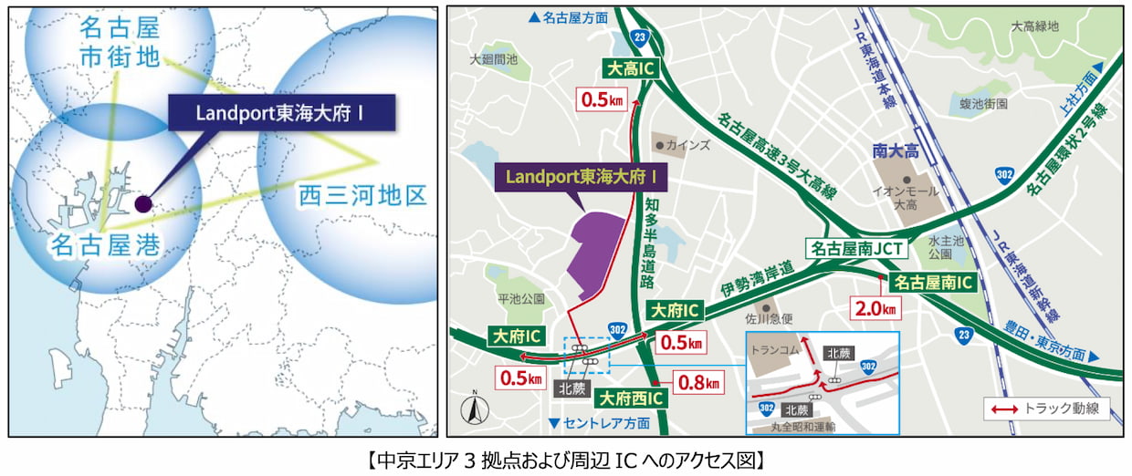 延床面積は24万6550平方メートルで、同社の開発物流施設の中でも最大の規模を誇る。立地は伊勢湾岸自動車道・大府インターチェンジ(IC)から500メートル、知多半島道路および名古屋高速3号大高線・大高ICからも500メートルと高速道路網への近接性に優れる。さらに名古屋港(東海新宝ふ頭)へ5.4キロと港湾アクセスも良好で、名古屋市内や西三河エリア、豊田市などの生産拠点にも30分から1時間圏でアクセスできる。