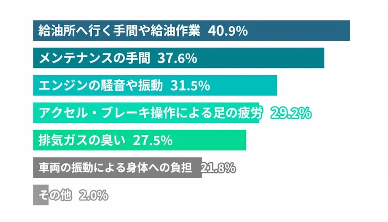 疲労やストレスが軽減されたと回答した人を対象に理由を尋ねると、「給油所に行く手間がなくなった」が51.2%で最も多く、「スムーズに加減速できる」が43.0%、「排気ガスの臭いがしない」の40.5%が続いた。