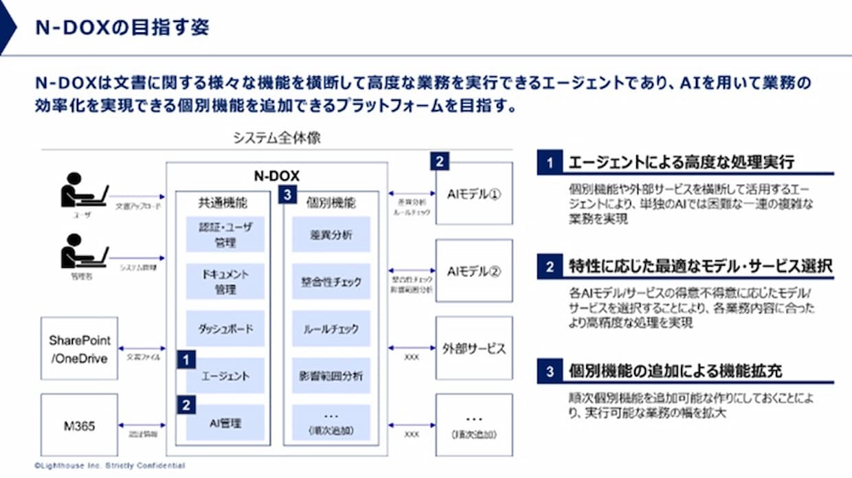 N-DOXは、文書管理・差異分析・ルールチェックなどを担う業務中枢ツールで、AIエージェントによる機能横断、業務に応じたAIモデル選定、段階的な機能拡張に対応する。開発はDX推進グループとドライバルク部門が連携し、3か月でプロトタイプを構築した。