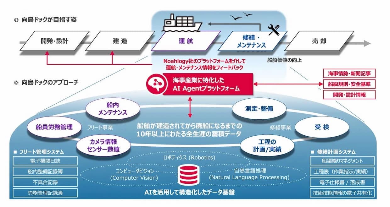 サービス・商品Noahlogy(ノアロジー、東京都港区)は22日、向島ドック(広島県尾道市)と共同で、船舶修繕に関する実績データを活用したAI(人工知能)基盤の共創を開始したと発表した。