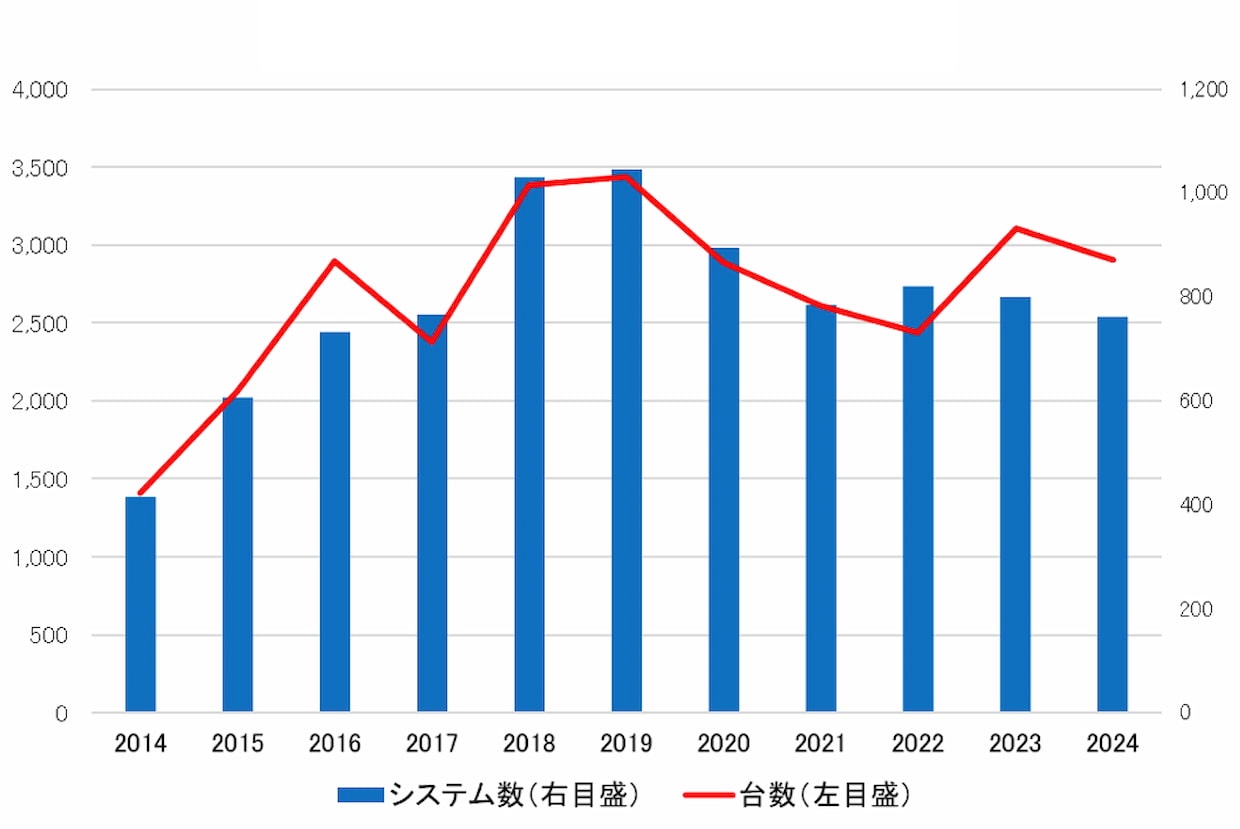 納入件数のうち国内向けは90.4%(91.1%)とほぼ横ばいで、海外向けは9.6%(8.9%)と1割に満たない。1システムあたりの台数では、国内向けは3.6台(前年は3.8台)、海外向けは5.4台(同4.6台)と、海外向けのほうが多かった。