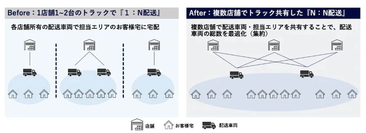 同システムは、配送件数や店舗間の需要に応じてリアルタイムで最適な配送ルートを算出するもので、関東・関西圏を中心に全国21店舗で導入。導入前は車両台数が21台必要だったが、同技術により15台に最適化され、配送効率は従来比で30%向上した。