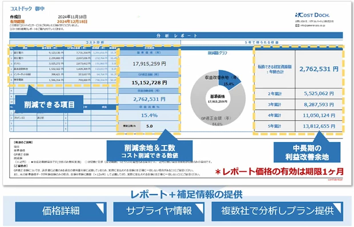 コストドックは、中小企業向けの無料オンラインサービスで、光熱費や通信費リース費用など40項目以上の間接費と間接業務を分析し、適正価格を算定。各種サービス事業者から見積もりを取得し、コスト削減を図ることができる。コストのほか、CO2排出量の算定も可能で、排出量削減策の作成にも役立つ。