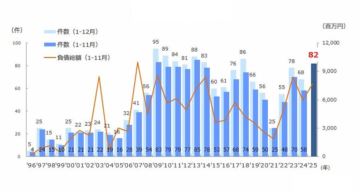 同社によると、11月までの倒産件数は前年比41.3%で、すでに前年の件数を上回った。80件を超えるのは2013年同期以来、12年ぶりで、09年の年間95件以来、16年ぶりに年間で90件台に乗せる可能性がある。