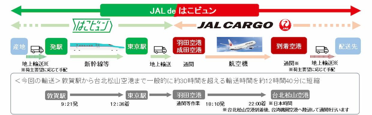両社はことし10月、仙台からシンガポールへナシを輸送するトライアルを実施しており、今回の正式サービス開始につながった。商品化第1弾では、福井県敦賀を起点に、越前がにや敦賀真鯛、若狭まはたといった水産品を台湾向けに輸送する。敦賀発の新幹線で東京駅まで運び、羽田空港から台北松山空港へ空輸。その後、桃園空港で通関する流れだ。