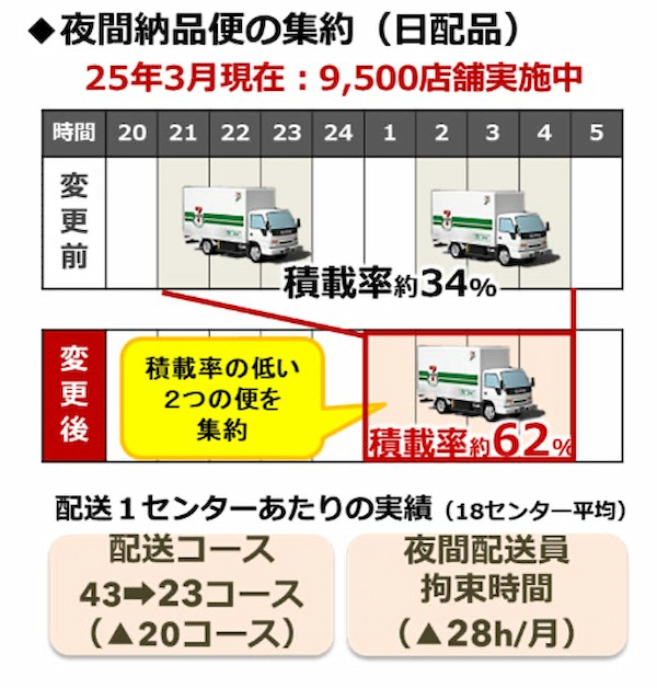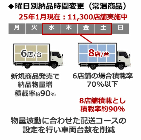 受賞対象となったのは、2024年問題を契機とした多面的な物流課題解決策。日配品では夜間納品便の集約を進め、25年3月時点で9500店舗に導入した。おにぎりやサンドイッチなどの配送便を束ねることで、積載率の改善と配送員の拘束時間短縮を図った。加えて、常温商品の納品については曜日別に納品時間を変更し、物量が増える月曜・火曜とそれ以外の曜日で配送設計を分ける手法を採用。25年1月時点で1万1300店舗に展開し、物流波動に合わせたコース最適化につなげた。