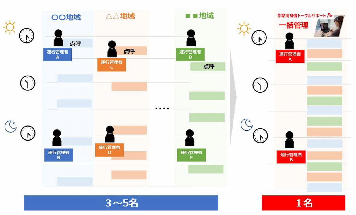 公共ライドシェアでは、運行管理者による運行管理業務の実施が義務付けられているが、要因不足から態勢を整えられないことも多い。このため、同社は同サポートのなかでオンラインによる点呼や記録、シフト作成などを行う遠隔運行管理を請け負い、自治体や運行団体の負担軽減を図っている。