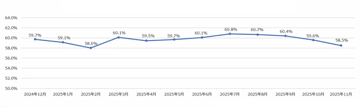 転職者全体に占める転職後に年収増加した個人の割合は58.5%で、同1.1ポイントのマイナスとなった。