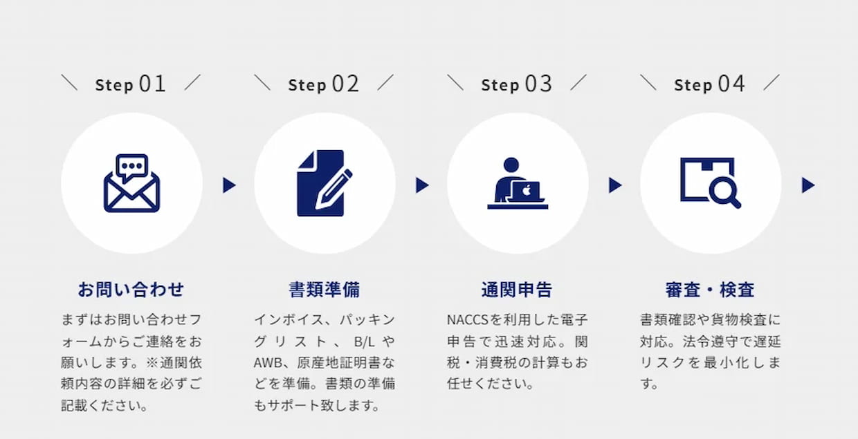新サービスでは、海上輸送貨物や大型貨物、商業貨物などを対象に、書類準備から税関申告、審査・検査対応までを一貫して支援する。時間外や土日・祝日の通関対応も可能とし、急なスケジュール変更や緊急案件への柔軟な対応を打ち出す。インボイスやパッキングリスト、船荷証券など基本書類の確認支援も行い、通関手続きに不慣れな輸入者の負担軽減を図る。