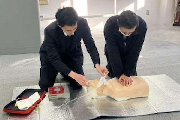 当日は、心肺蘇生法や自動体外式除細動器(AED)の取り扱い方法について、実技を交えながら講習が進められた。意識のない人を発見した際の安全確認から、周囲への協力要請、呼吸の確認、胸骨圧迫に至るまでの一連の流れを段階的に学習し、工程ごとに実践を行った。講座終盤では、救急車到着までを想定し、複数人で交代しながら胸骨圧迫を継続する訓練も行われ、実際の緊急時を想定した対応力の向上を図った。