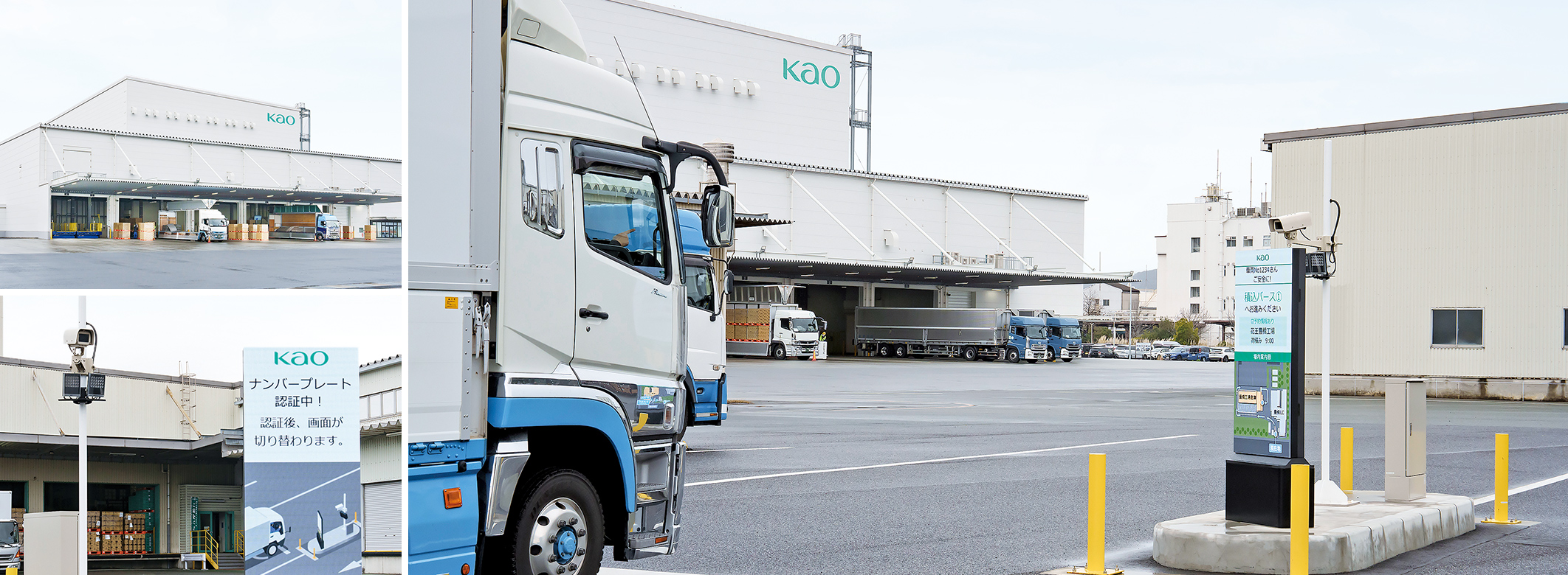 Hacobu(ハコブ、東京都港区)のバース予約システム「MOVO Berth(ムーボ・バース)」と連携した花王豊橋工場(愛知県豊橋市)の事例では、場内トラック運行のスマート化によりトラック入出場管理を無人化。手書きの受付表を廃止し、デジタルデータとして正確な時間を記録することで、荷待ち時間の可視化と短縮を同時に実現し、車両の在場時間を1時間以内に抑制することに貢献した。