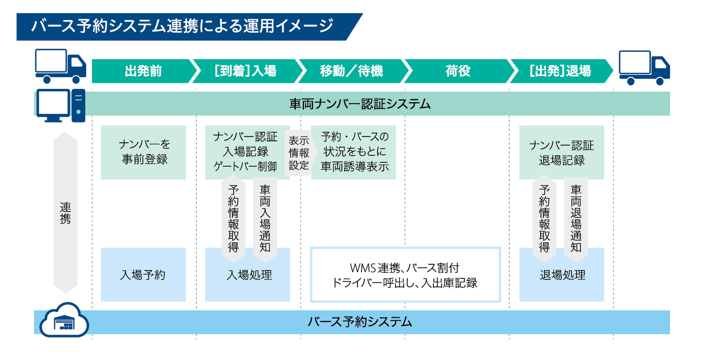 同社のシステムは、バース予約システムと連携することで車両入退場の省力化に威力を発揮する。具体的な運用フローはこうだ。