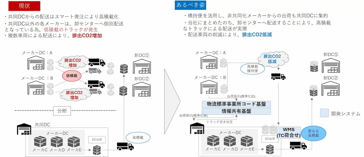 TC構想では、丸紅ロジスティクスが運営するDCをTCとして開放し、同社が倉庫運営を担っていないメーカーも含めて幹線輸送を集約。2次配送の共同化を段階的に拡大し、便の統合や積み合わせを進める。中核施策として、プラネットと連携した納品先コードの統一に取り組み、メーカー・卸・小売間のデータ連携を円滑化する。