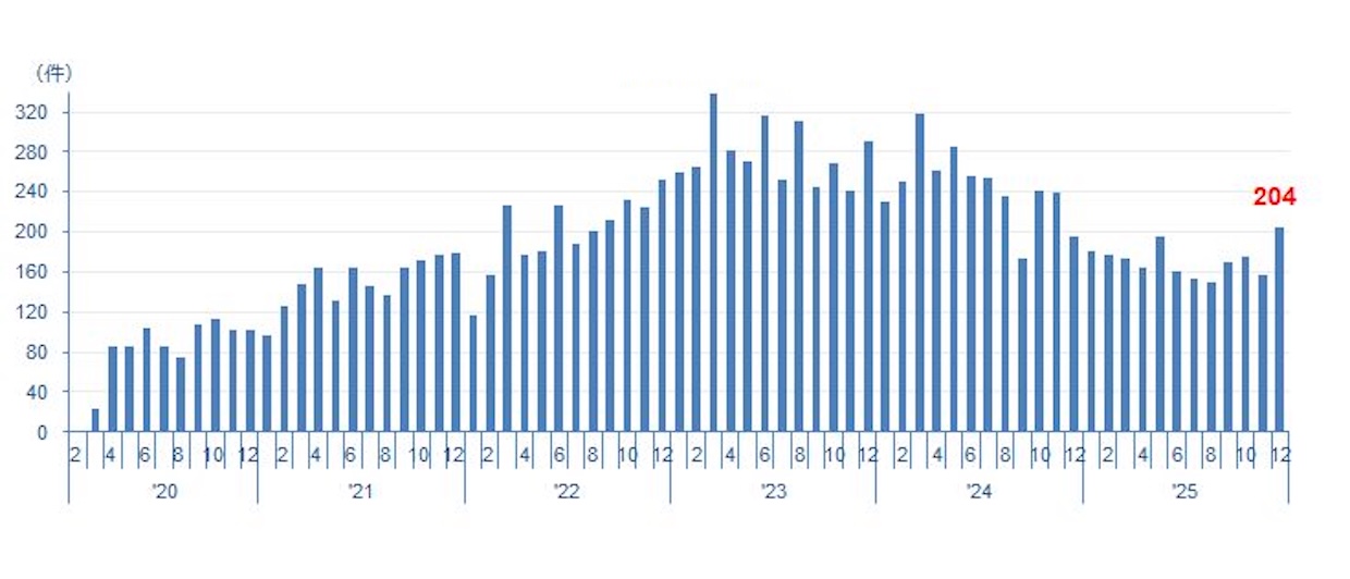 25年は、5月に5か月ぶりの190件超えを記録後、9月以降再び増加傾向となり、10月は176件、11月は158件、12月は204件と推移している。新型コロナ関連破たんは、依然として全体の倒産件数の2割を占めており、収束には至っていない。