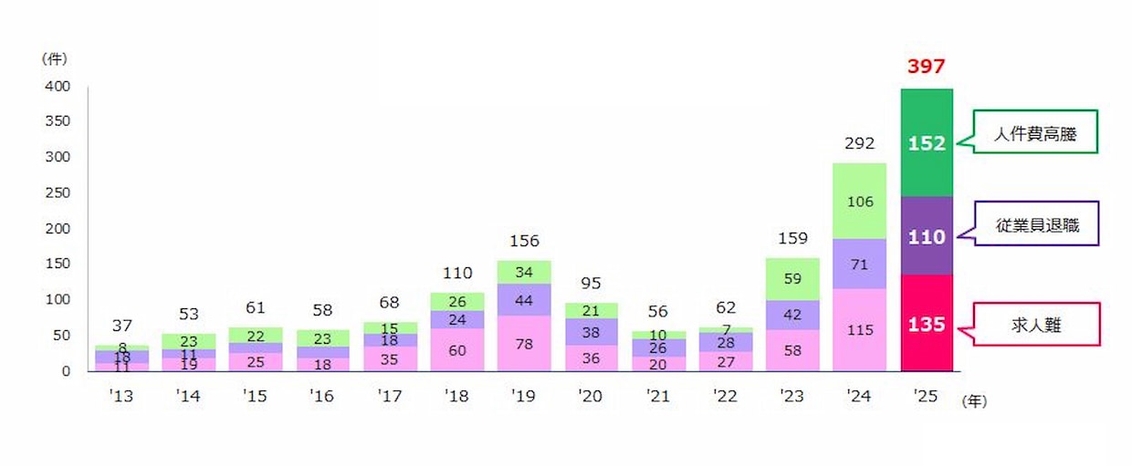 調査・データ東京商工リサーチ(TSR、東京都千代田区)は7日、2025年に「人手不足」を原因とする企業倒産が397件に上り、過去最多となったと発表した。前年比35.9%の増加で、4年連続の増加となる。