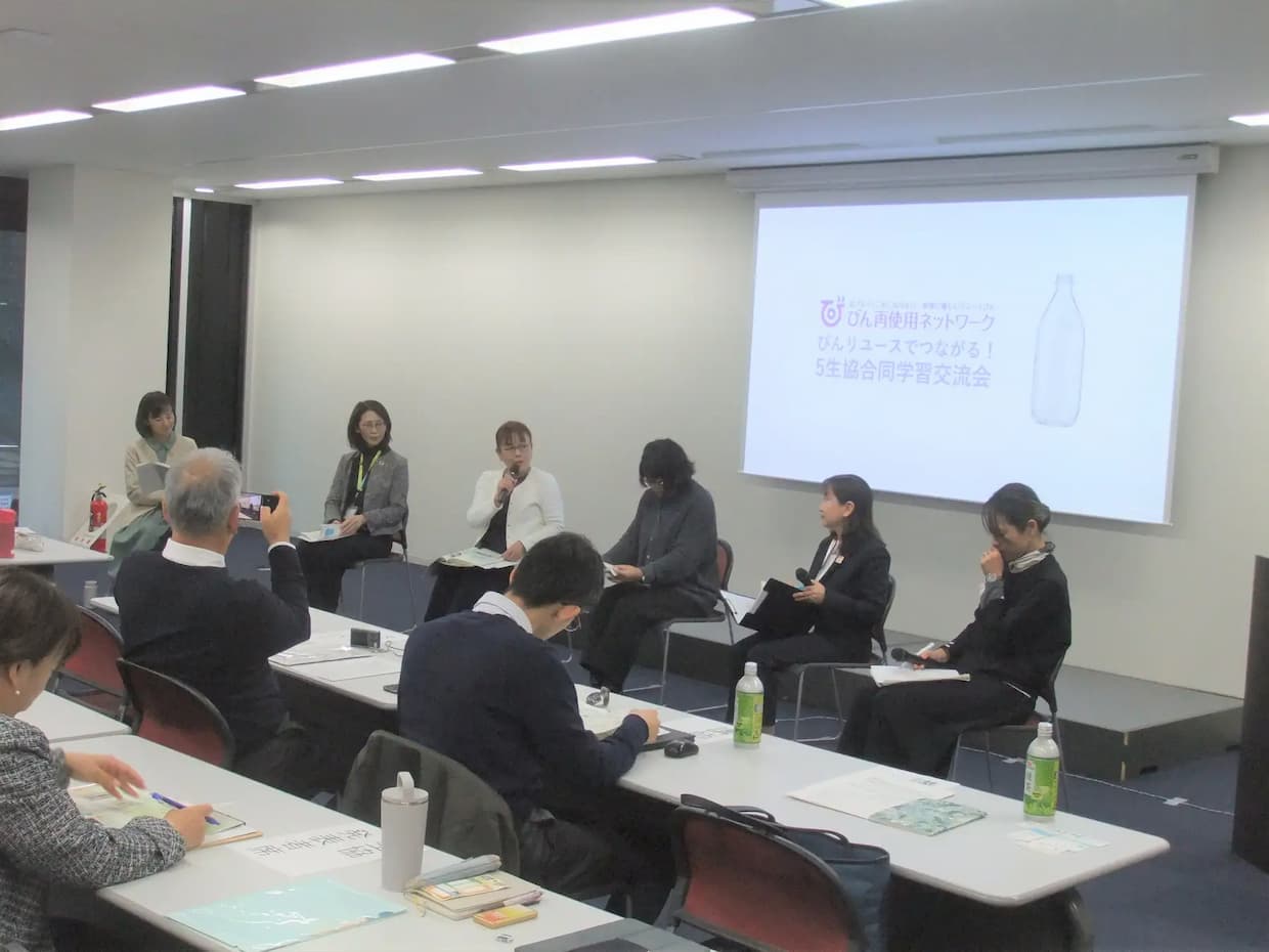 環境・CSRパルシステム連合会(東京都新宿区)は8日、びん再使用ネットワークに加盟する5生協合同で、びんリユース普及に向けた交流会を12月15日に本部で開催したと発表した。資源循環をテーマに、リサイクルとの差異や環境負荷削減の重要性を学び、取り組みの報告と意見交換を実施した。