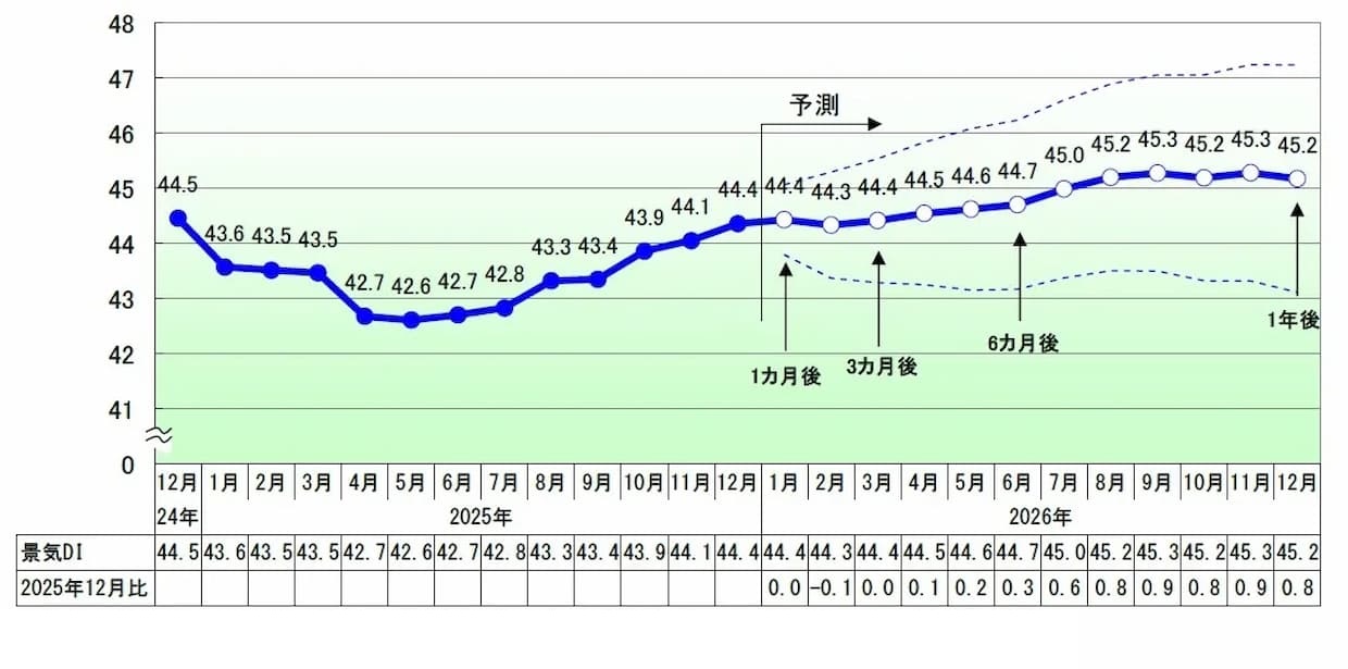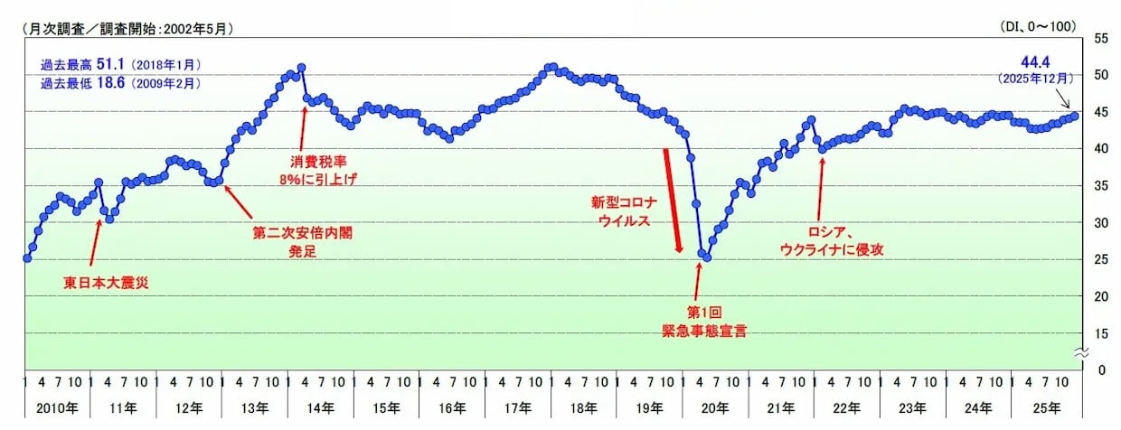 調査・データ帝国データバンク(TDB、東京都港区)は8日、2025年12月の国内景気動向調査の結果を発表した。景気DI(景況判断指数)は前月比0.3ポイント増の44.4となり、7か月連続の改善となった。
