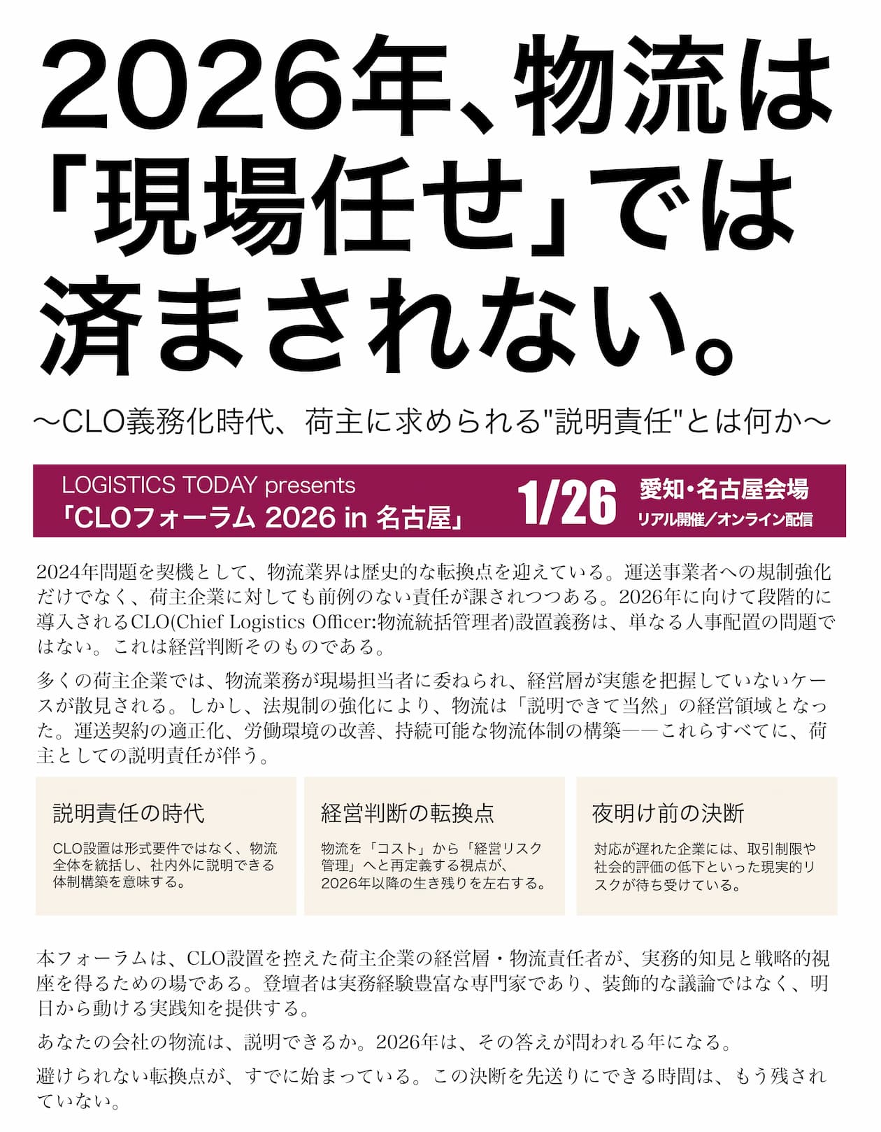 イベントLOGISTICS TODAYは2026年1月26日(月)、荷主企業の物流部門・調達部門・法務部門の皆さまを対象とした「CLOフォーラム 2026 in 名古屋」を開催。