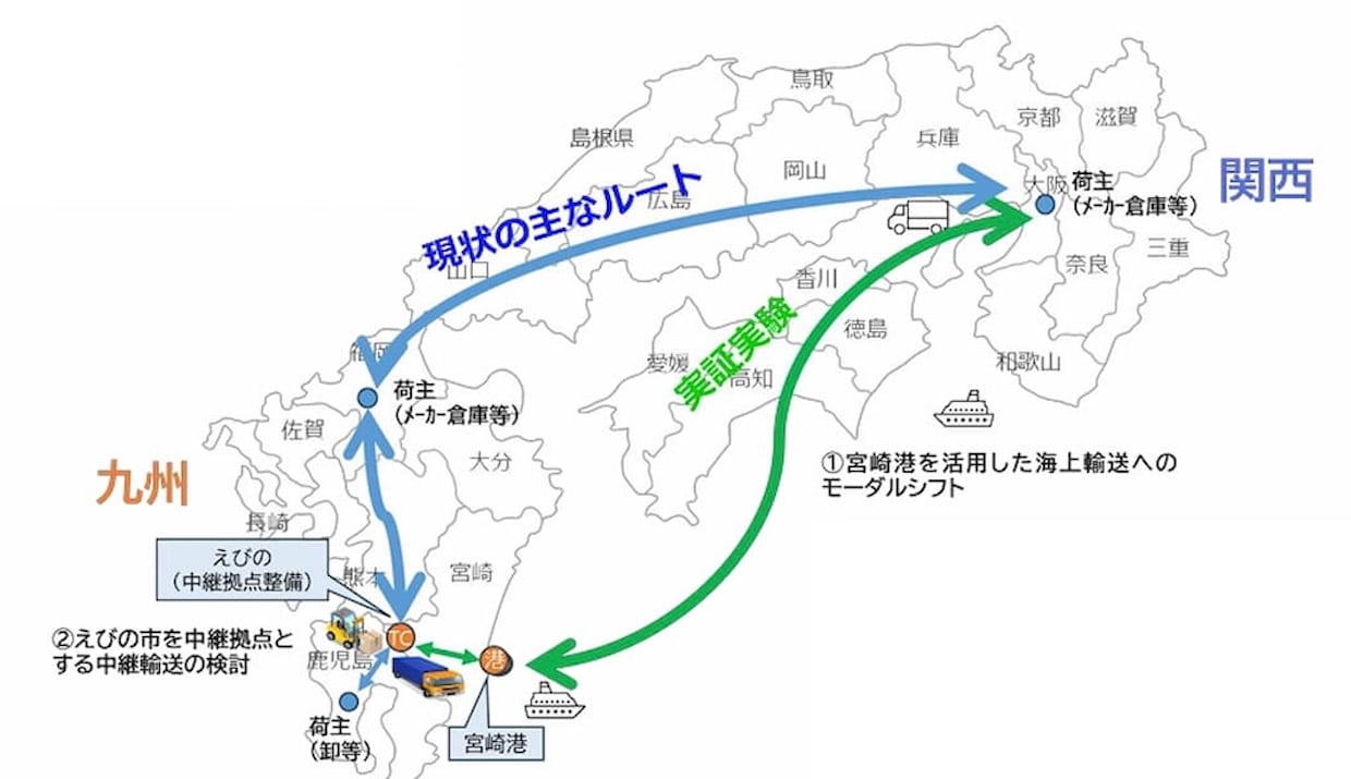 実証では、神戸港-宮崎港間のフェリー輸送と、宮崎県えびの市の中継拠点を組み合わせる。往路は関西から南九州へ日用雑貨などを輸送し、復路は南九州発の酒類・飲料を積載して大阪方面へ戻す。中継拠点を介した集出荷と往復輸送により、片荷の解消と輸送効率の改善を図る。実証は14日から開始する。
