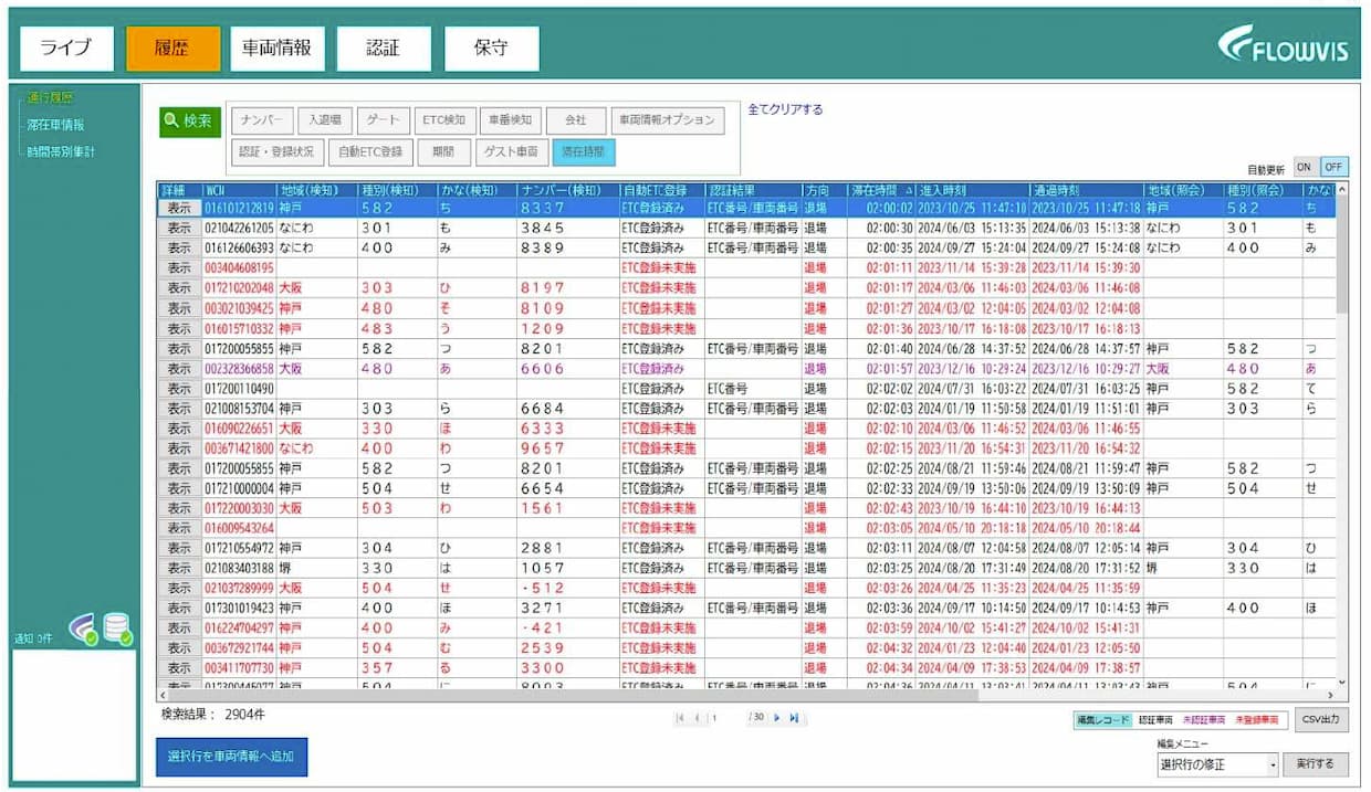 FLOWVISは、ETCと車番認識を併用して車両を自動検知し、入退場時刻と構内滞在時間を記録する仕組みだ。ドライバー操作を前提とせず、受付での記帳やタブレット入力も不要になる。記録されたデータは一覧・集計でき、本社報告や改善検討にそのまま使える。西村氏は「入退場をトラックドライバーに申告させるようにしても、退場の際に申告をしないで出て行ってしまうというケースもある」と指摘。「これでは記録の体をなしていないし、ドライバーに負荷をかけずに入退場記録を自動的に取ることが重要」と語る。