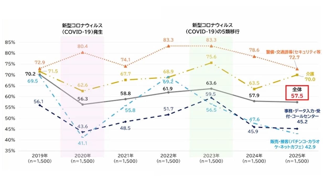 一方、2025年にアルバイト人材の不足を感じた企業は57.5%と2年連続で減少した。採用目標人数は減少したものの、達成率は64.6%と近年で最も高く、人手不足感はやや緩和している。背景には、定型業務を中心にAIや自動化が進み、人手への依存度が下がっていることがある。