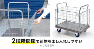 同製品はステンレス製のかごを備え、細かい荷物も安全に運搬可能。かごの一面はストッパー操作で高さを調整できる2段階開閉式となっており、作業のしやすさが向上している。さらに、左右両側に太めの取っ手を配置し、どちらの向きからでも操作可能な利便性も確保した。
