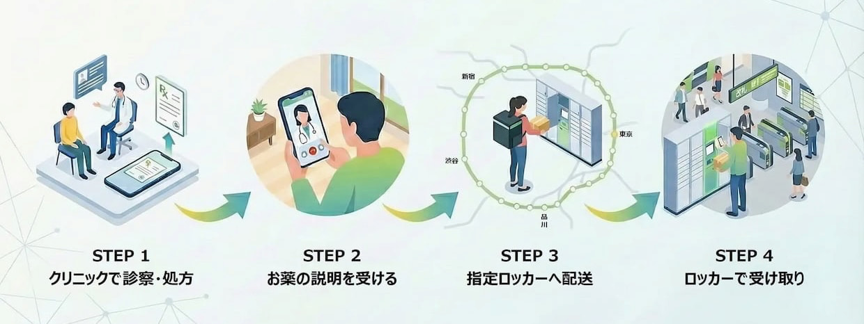 利用者はオンライン服薬指導後、受け取り方法としてロッカーを指定する。12時までに申し込みが完了すれば、最短で受診当日の18時以降に指定駅で受け取ることが可能だ。受け取り時間は18時から翌日10時までで、期限を過ぎた場合は自宅配送に切り替わる。料金は従来のとどくすりと同水準とし、追加負担は生じない。