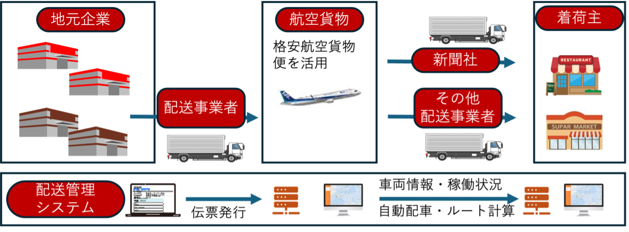 具体的には、鹿児島と首都圏を結ぶ航空貨物幹線を基軸に、地域内か都市部のラストワンマイル配送に新聞配送網を活用。エニキャリのシステムにより、航空機や車両の空きスペースを可視化し、シェアリングすることで積載効率の向上を図る。これにより、従来はトラック輸送で日数を要していた鹿児島県産の農産物や海産物などを、当日中に首都圏へ届けることを目指す。